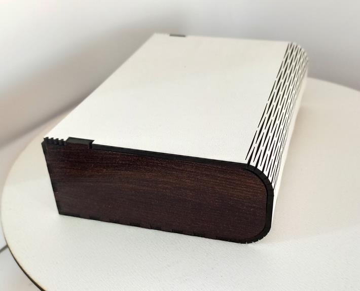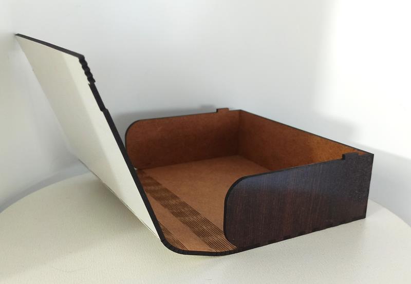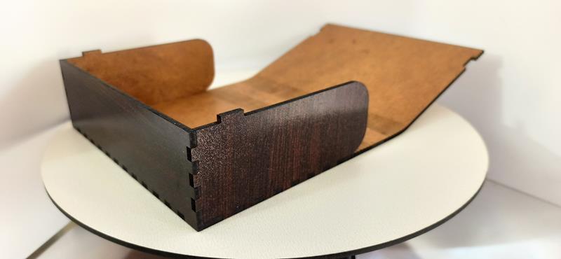 Основание кейса белого цвета изготовлено по технологии гибкий рез, боковые элементы выполнены в цвете венге. Материал ламинированный ХДФ 3мм. Габаритные размеры (Д*Ш*В) 160*120*50мм. Магнитный замок.